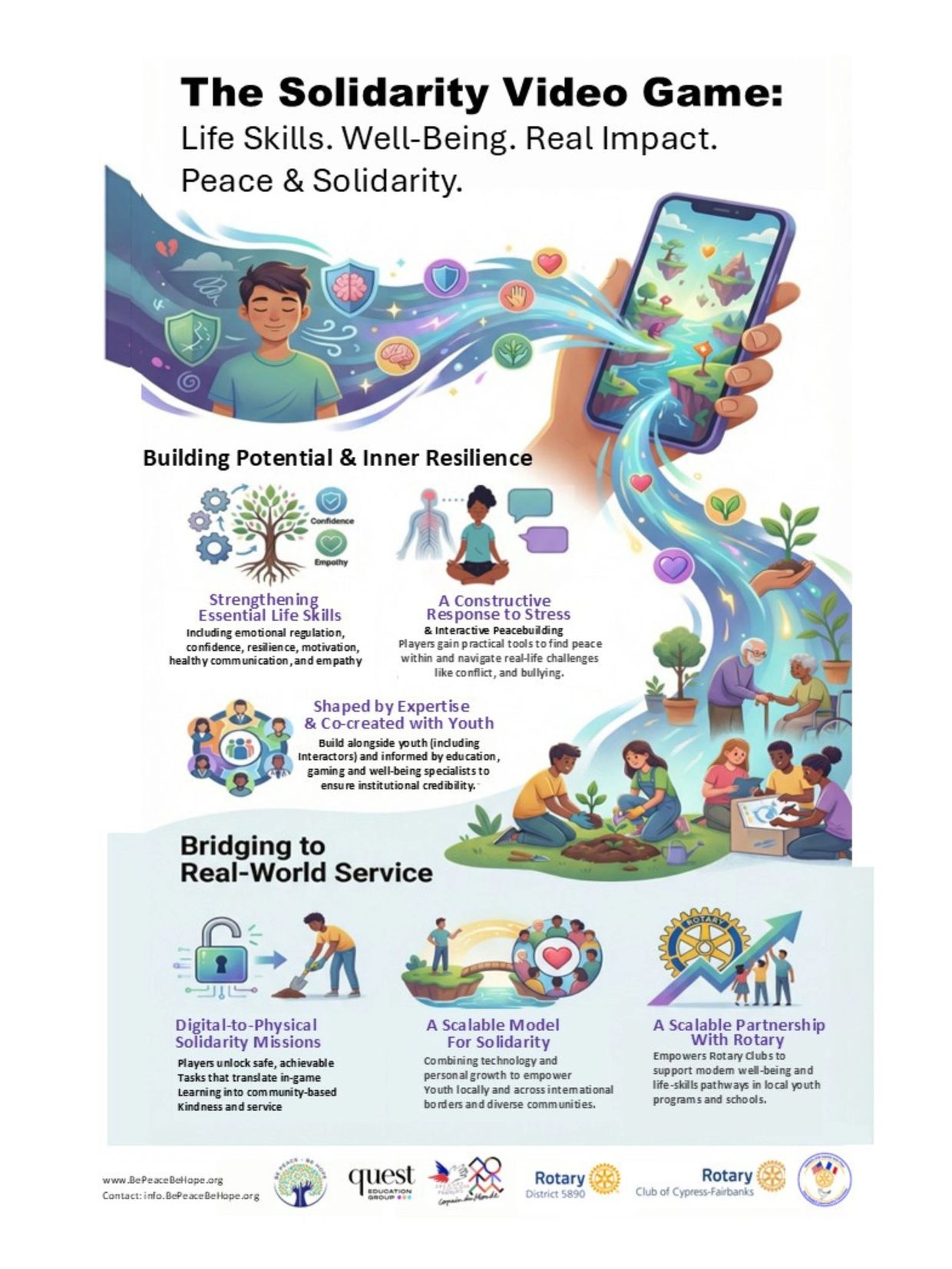 The Solidarity Video Game is a youth-centered, story-driven, mobile-first experience designed to help young people strengthen essential life skills—emotional regulation, resilience, confidence, empathy, motivation, and healthy communication—while learning to respond constructively to real-life challenges like stress, conflict, exclusion, and bullying. Through engaging gameplay and “solidarity missions” that connect the digital experience to positive actions in the real world, the game helps youth grow their potential and well-being while building stronger, more caring communities.